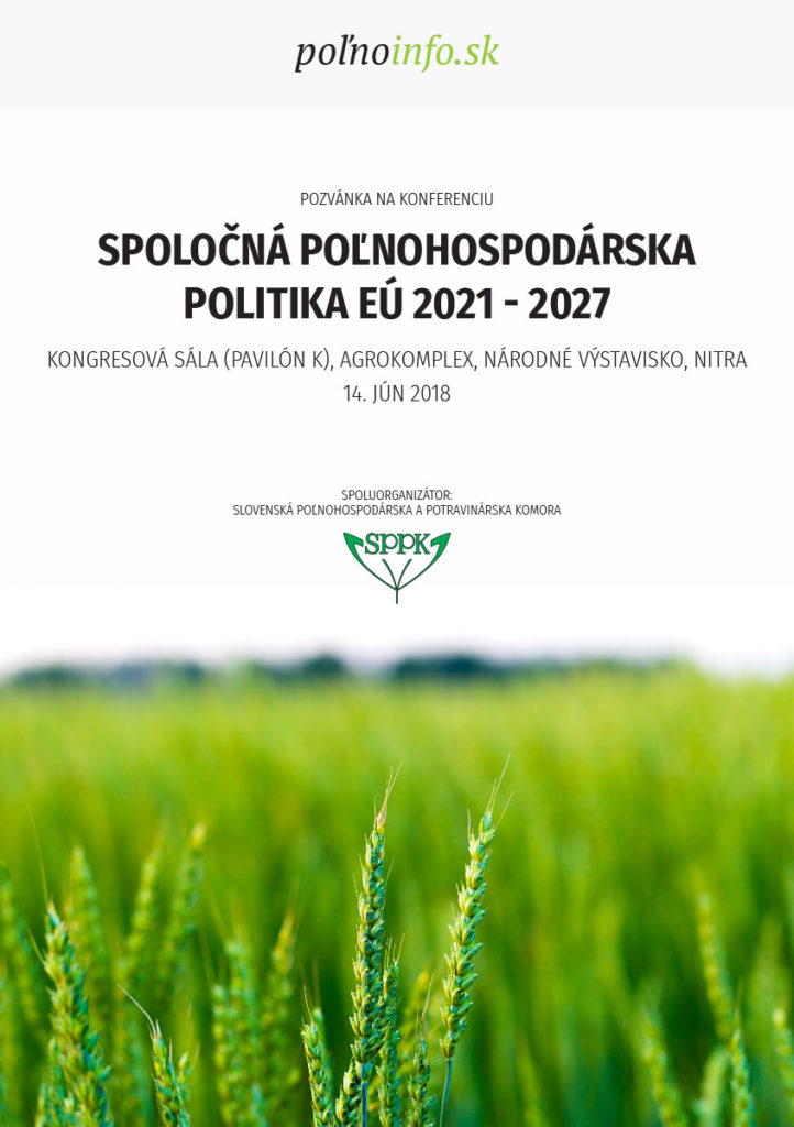 Konferencie 2022 Financovanie poľnohospodárskych subjektov po roku 2023 8. december 2022, Nitra Počet účastníkov: 450 hostí Sektorové intervencie: Možnosť ako podporiť produkciu 30. jún 2022, Veľký Biel Počet účastníkov: 50 hostí 2021 Ekoschémy 2023 – 2027 Podpora udržateľného poľnohospodárstva a vidieka 23. september 2021, PD „Brezina“ Pravotice Počet účastníkov: 250 hostí 2019 Strategický plán: Príležitosť obnoviť lesk nášho poľnohospodárstva 20. jún 2019, Nitra Počet účastníkov: 150 hostí 2018 Spoločná poľnohospodárska politika EÚ 2021 – 2027 14. jún 2018, Nitra Počet účastníkov: 200 hostí
